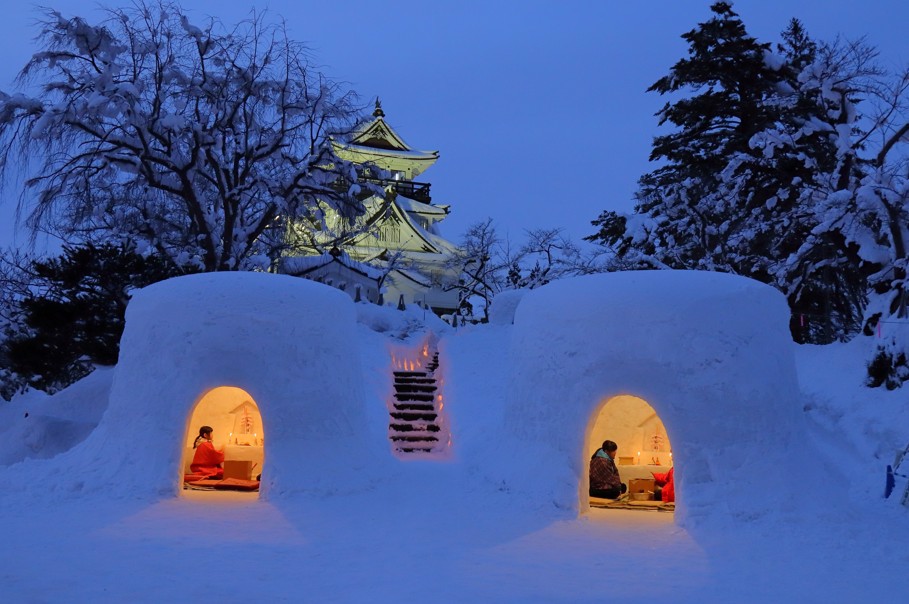kamakura—snow huts built throughout the city. Inside each hut, locals offer rice cakes and sake to the water deity, inviting visitors to enjoy warm