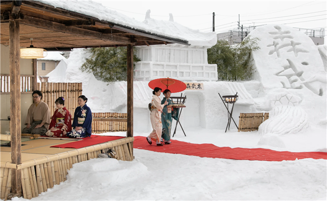 Juste au sud de la région du Tohoku, dans la région de Chubu, Tokamachi est réputée pour son charme. Non seulement elle abrite certains des plus beaux motifs de kimono du Japon, mais c’est également la ville la plus enneigée de l’île principale, Honshu. Le Festival de la Neige de Tokamachi (du 20 au 22 février 2026) célèbre les merveilles de l’hiver avec des sculptures de glace magnifiques, illuminées la nuit, et un défilé de mode de kimono reconnu par le Livre Guinness des records comme la plus grande scène de glace du monde. Alors que l’histoire traditionnelle du kimono, qui s’étend sur 1 500 ans, se poursuit, découvrez les dernières tendances et fêtez l’élection de la reine du kimono de cette année. Cet exceptionnel carnaval des neiges propose également des concerts en direct, des spectacles de danses folkloriques japonaises et des feux d’artifice.